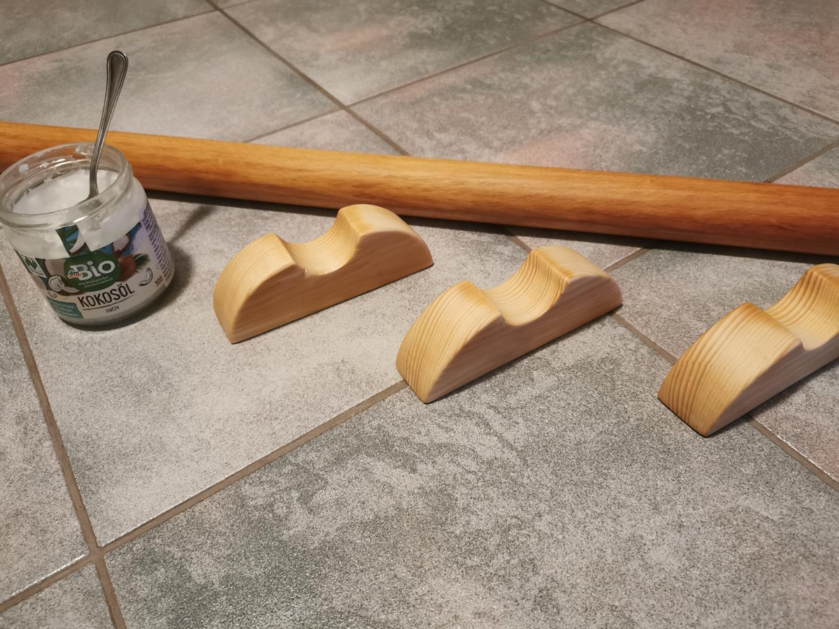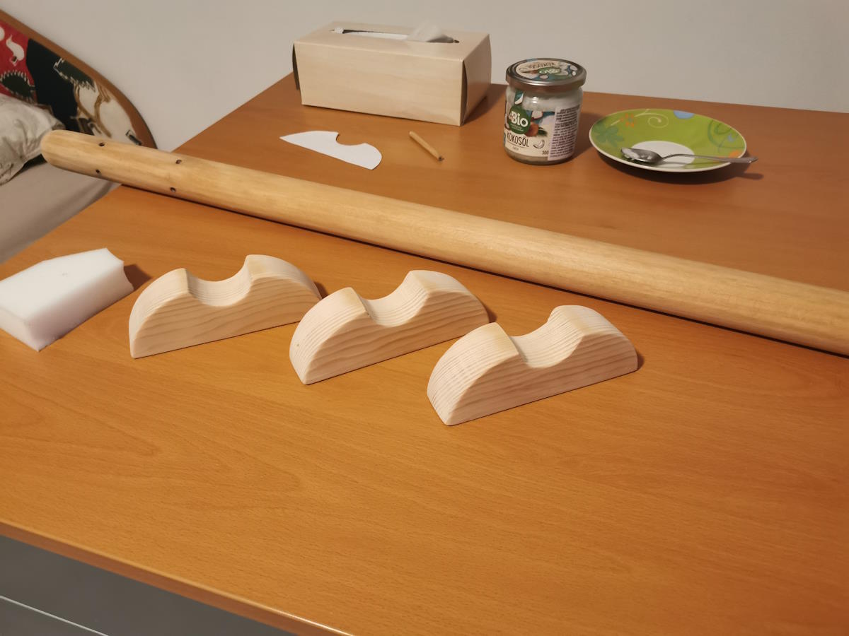 Základom tohto takmer 2-metrového projektu bol starý, vyhodený drevený vešiak na kabáty zo smetiska. Odstránil som všetko nepotrebné, kým mi neostala čistá drevená tyč. Z nového smrekového dreva som vyrezal minimalistické konzoly, ktoré tyč držia pevne a stabilne nízko nad zemou.