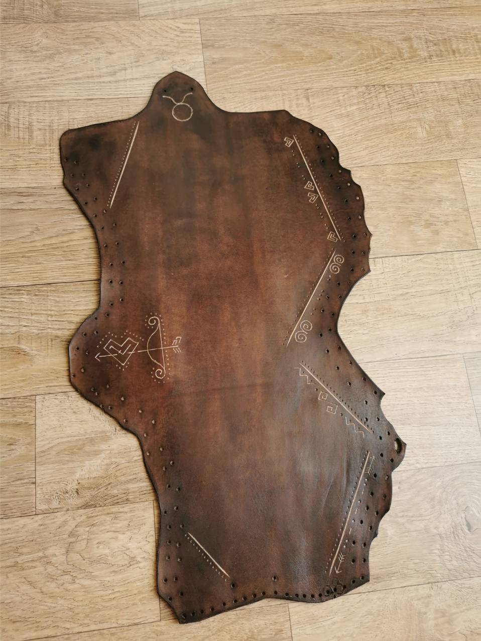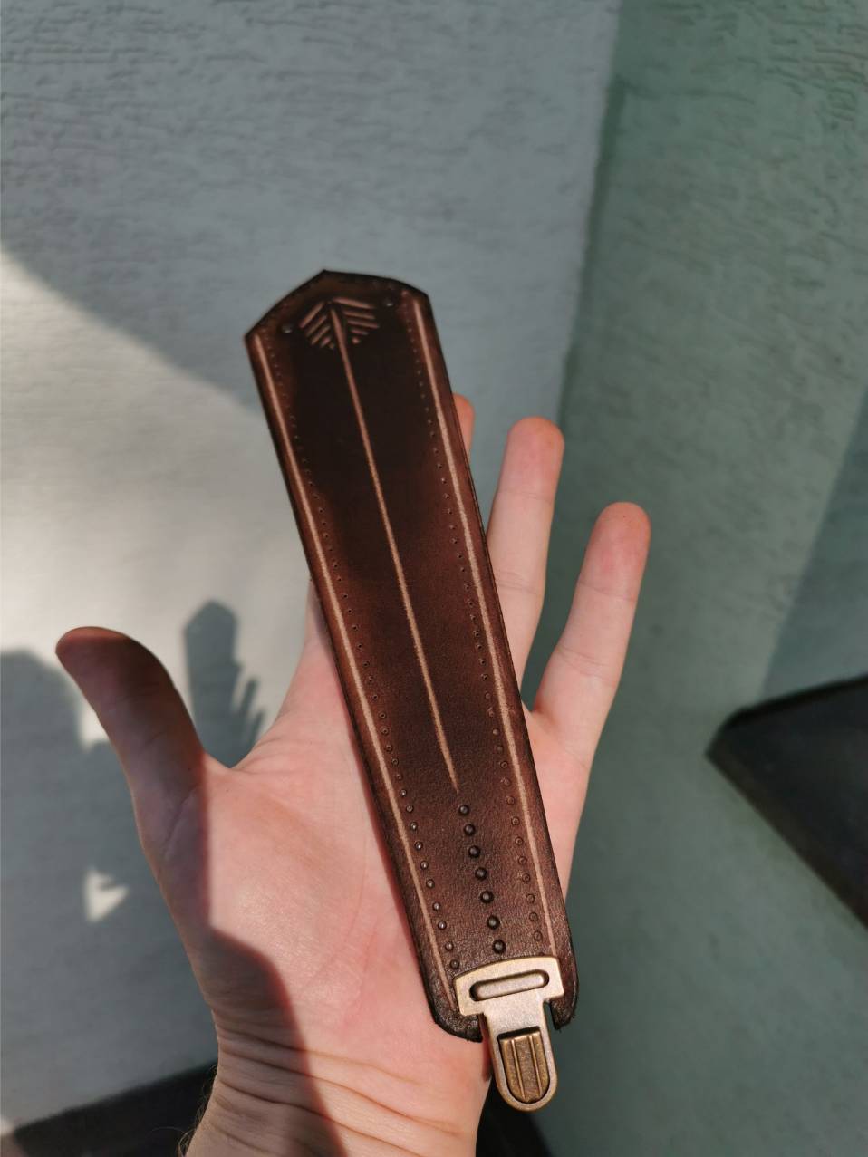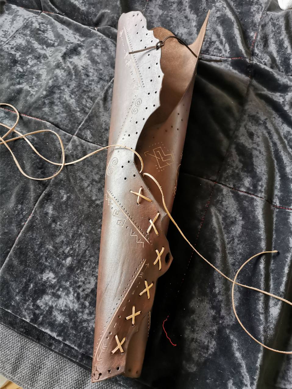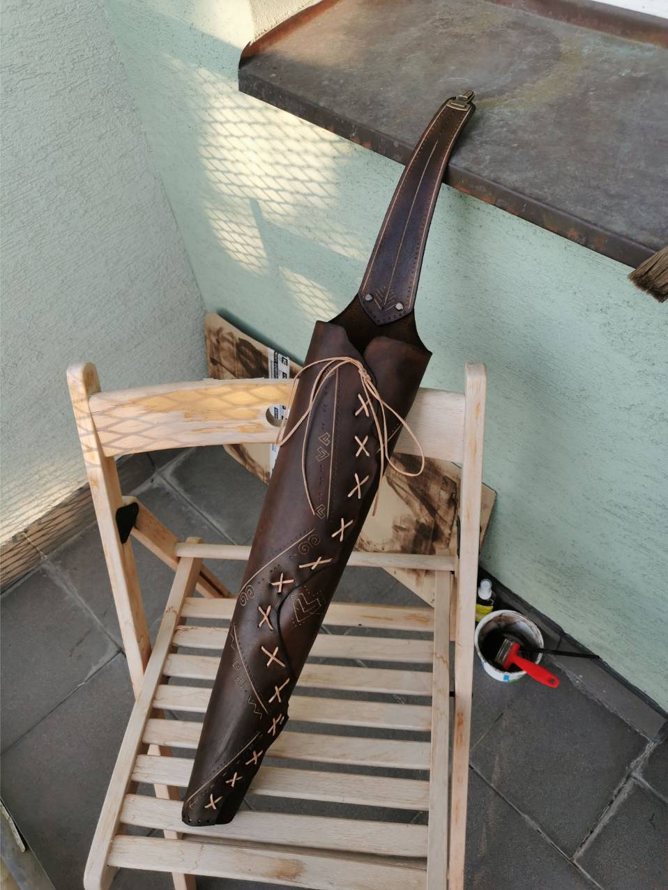 Kožu som si sám vyčinil a nafarbil, ručne zošil a doplnil o masívne mosadzné prvky a pracky. Tulec som zdobil ručne gravírovanými čičmianskymi a slovenskými vzormi.