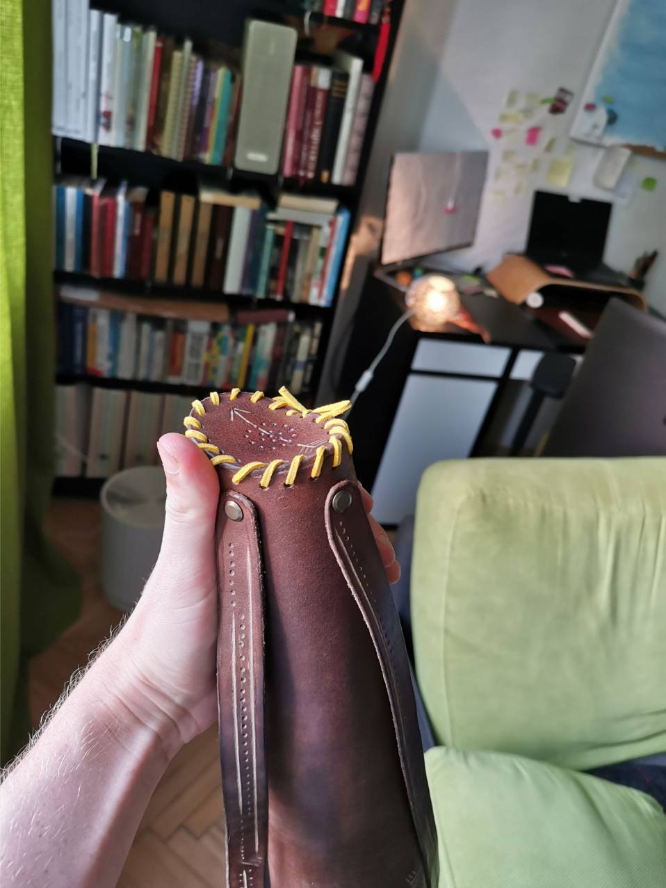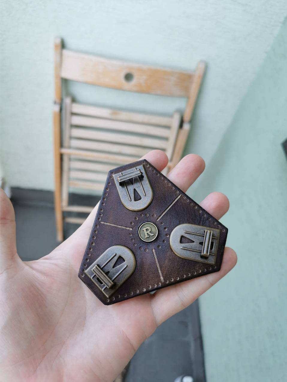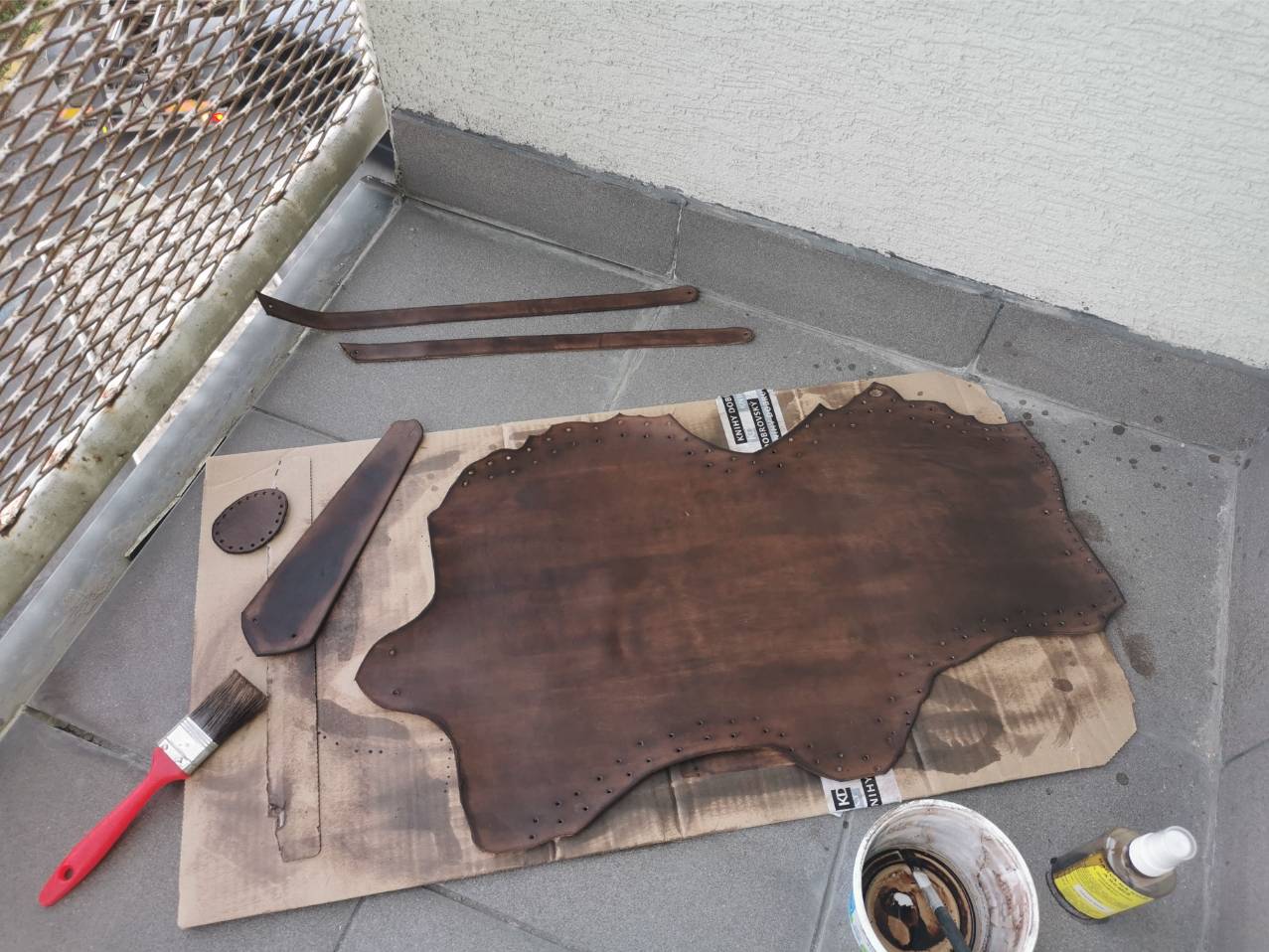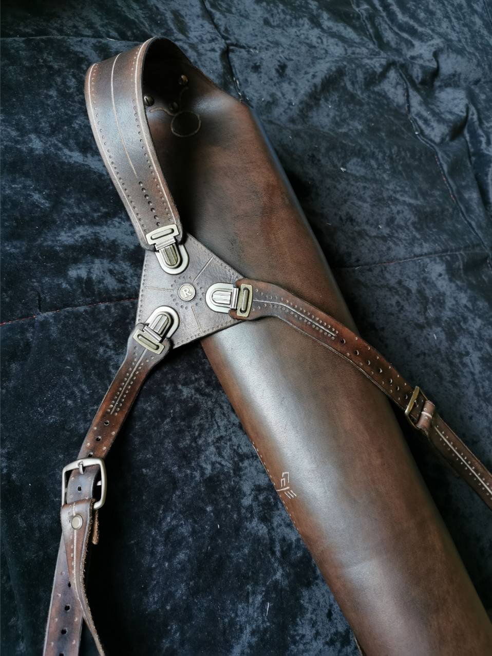 Kožu som si sám vyčinil a nafarbil, ručne zošil a doplnil o masívne mosadzné prvky a pracky. Tulec som zdobil ručne gravírovanými čičmianskymi a slovenskými vzormi.