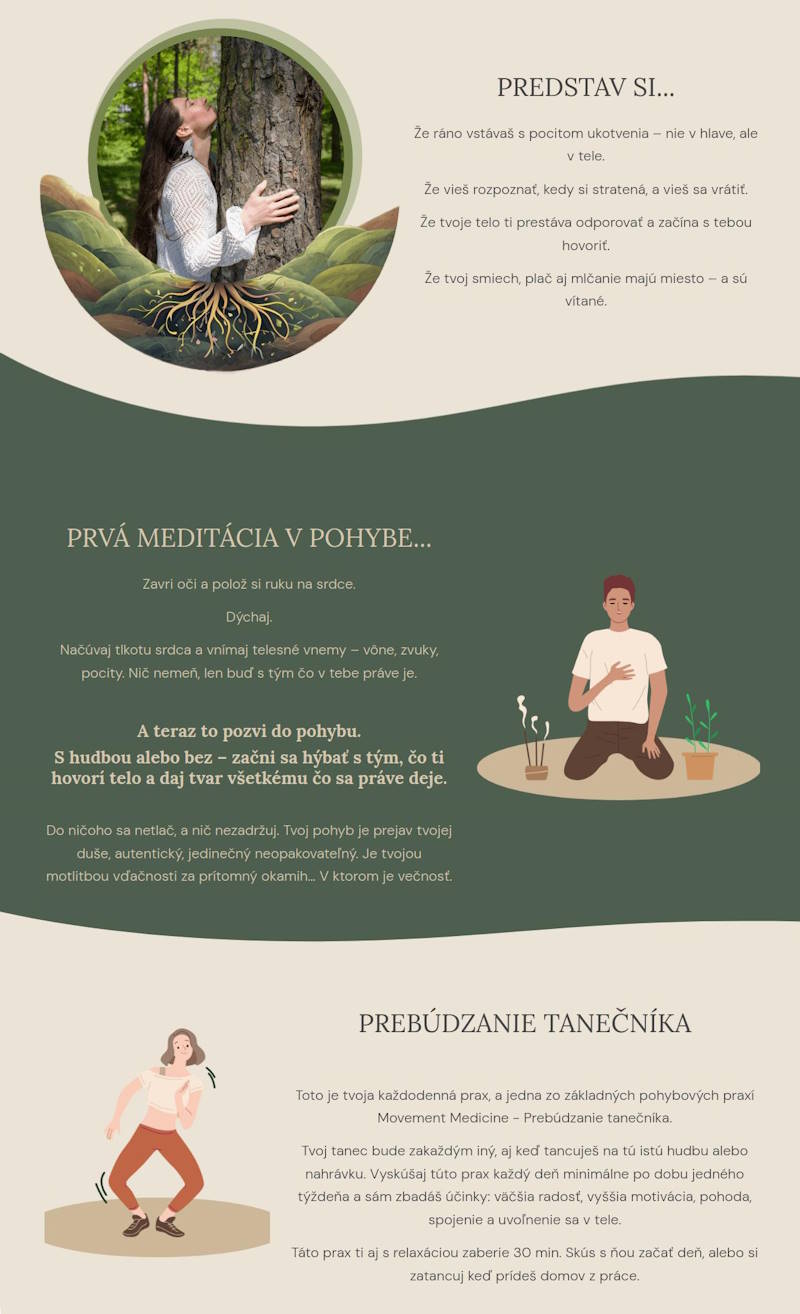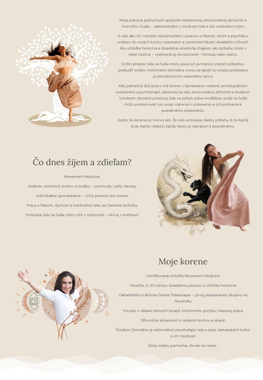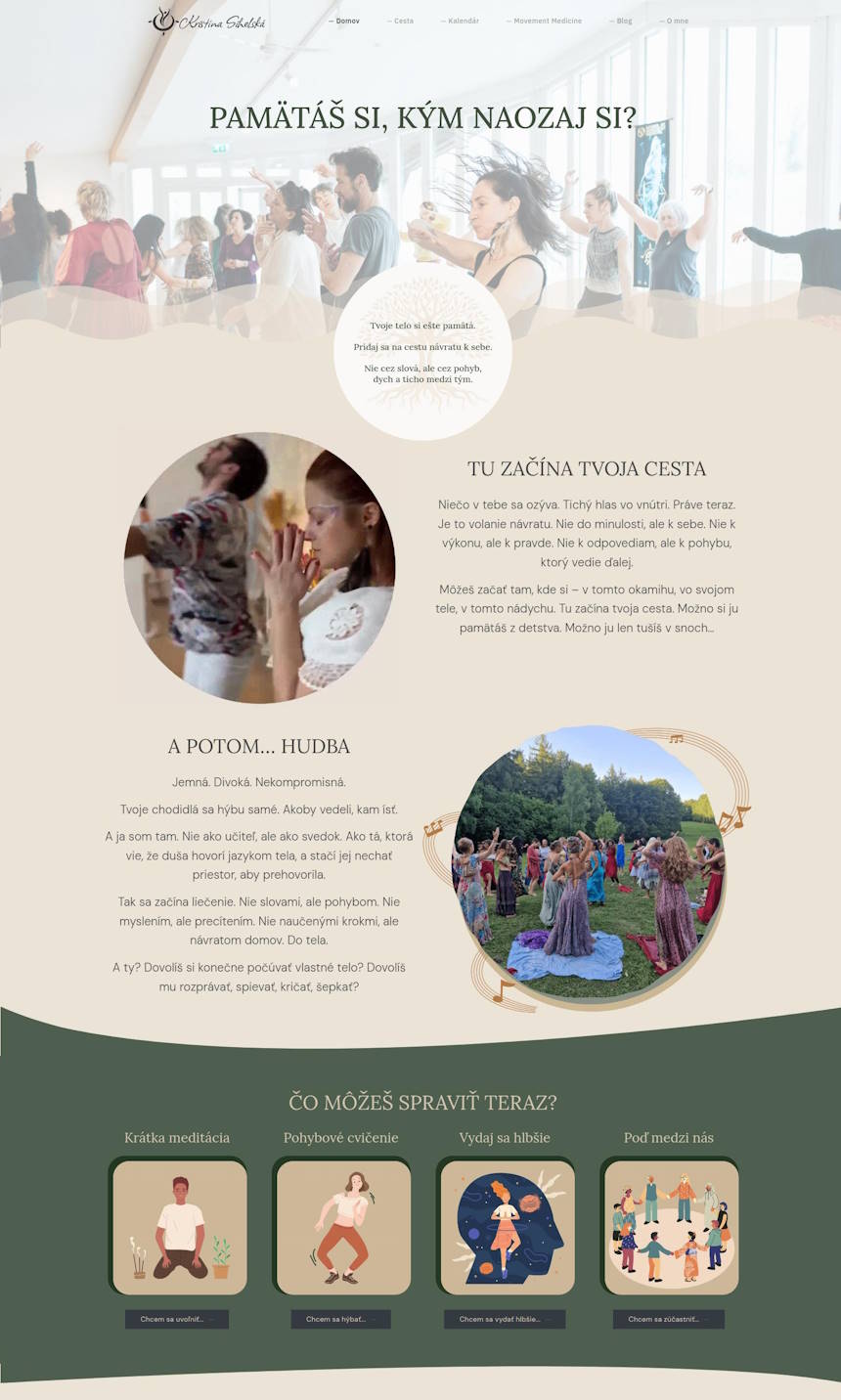 Pohyb je oslavou toho, že sme nažive – a tento web mal za cieľ túto oslavu zhmotniť v online priestore. Kristy neponúka len lekcie, ale hlboké zážitky a návrat k biologickej podstate. Web som postavil tak, aby návštevník cítil túto emóciu od prvého kliku.
